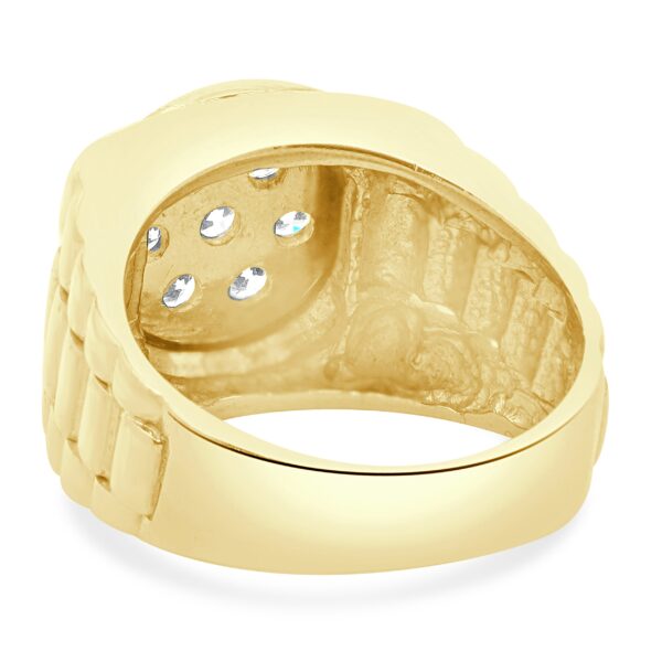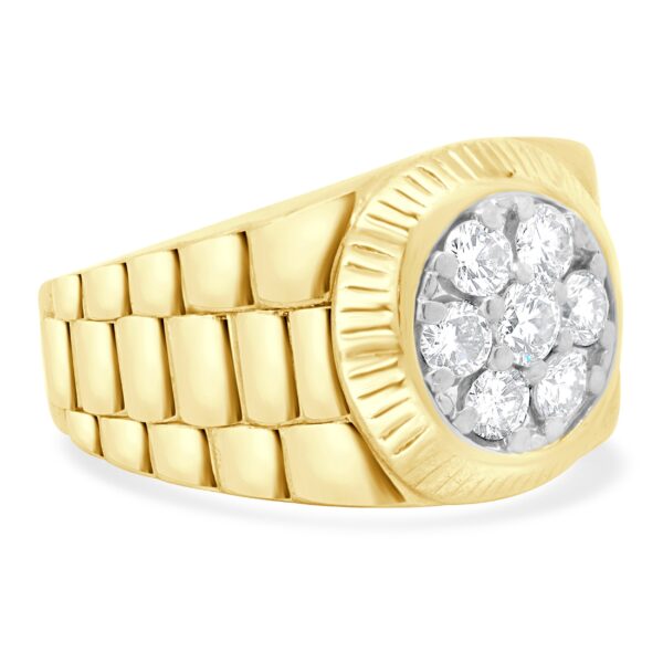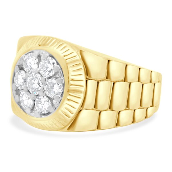 Crafted in solid 18k yellow gold, the ring offers a rich, warm contrast to the shimmering stones, enhancing its visual appeal. The durable mount and precise stone setting highlight the clean lines and symmetry, blending a classic cluster architecture with a modern, sophisticated design. Weighing 14.51 grams and adjustable to your perfect fit, this ring, sized at 9, is not just an accessory but a statement of refined luxury and enduring style.