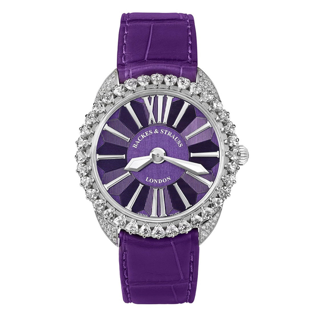 Indulge in the exquisite allure of the Backes & Strauss Piccadilly Renaissance 33, a masterpiece of horological artistry. Encased in 18k white gold, this timepiece dazzles with a fixed diamond-set bezel, showcasing the unparalleled brilliance of expertly-cut gems. The 33mm case elegantly frames an alluring purple dial adorned with Roman numeral index markers, exuding a regal sophistication. Powered by precise manual wind movement, every detail of this watch speaks to exceptional craftsmanship. The sapphire crystal ensures durability while the purple leather band with an 18k white gold folding clasp adds a touch of luxurious comfort. This watch is not just a timepiece; it’s a statement of elegance.