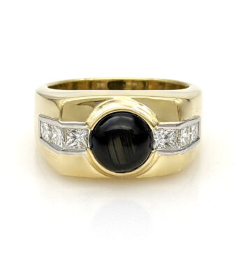 Presenting a masterpiece of modern elegance, this men’s ring features a striking contrast of elements that command attention. The bold carbon-striped inlay forms the centerpiece, seamlessly integrated with the rich, warm glow of 14 karat rose gold. Accentuated by eight round-cut black diamonds, totaling 0.16 carats, this piece exudes a sophisticated allure. The diamonds’ inky depths are perfectly complemented by the carbon’s sleek lines, creating a harmonious blend of strength and style. With a ring size of 10.25 and an impressive weight of 11.9 grams, this non-sizable ring is crafted to perfection, emphasizing precise alignment and a refined finish. Ideal for those with a discerning eye for contemporary design, it embodies both luxury and modernity in one captivating statement piece.