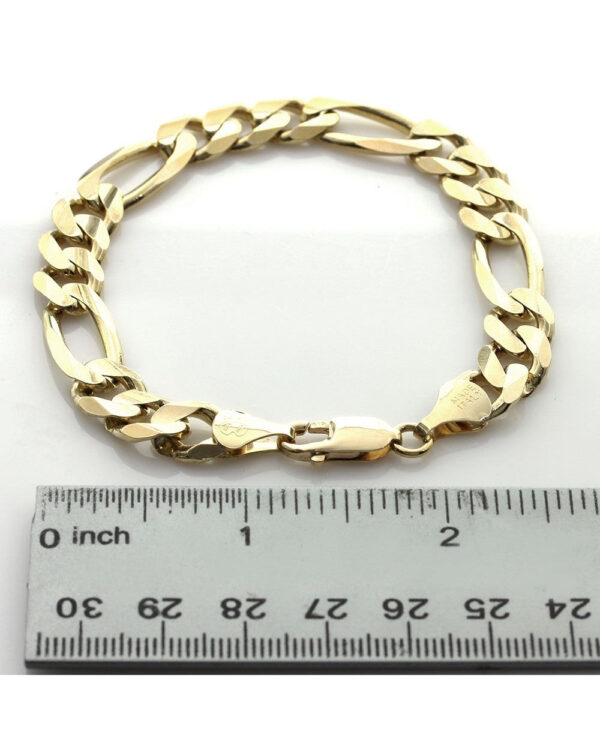 Exuding timeless elegance, the Figaro Link Bracelet in Yellow Gold is a striking addition to any wardrobe. Crafted from 14k yellow gold, this piece offers both durability and refined style. Measuring 8 inches in length and 9.36mm in width, it rests comfortably on the wrist, while its weight of 27 grams accentuates its substantial, high-quality feel. The intricate Figaro link design showcases meticulous craftsmanship, seamlessly blending classic aesthetics with modern appeal. Finished with a secure lobster clasp, it ensures both style and security. Perfect for the discerning individual who values understated luxury, this bracelet is marked with the 14K FF hallmark, guaranteeing authenticity and excellence.