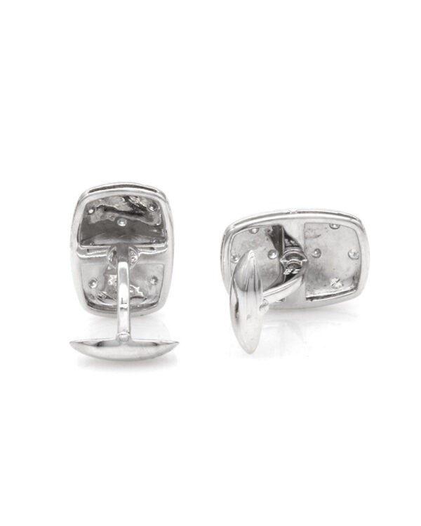 Crafted with precision, these flush diamond cufflinks exude a contemporary elegance that’s hard to ignore. Meticulously set in satin-finished 18K white gold, each cufflink is adorned with ten round brilliant cut diamonds, totaling 0.46 carats and ranked SI1-I1 for clarity with a G-H color range. Measuring 19.3mm by 13.5mm, these cufflinks are perfectly proportioned to enhance any formal ensemble. With a weight of 12 grams, they balance luxurious heft with refined design. The craftsmanship is evident in their polished finish and precise detailing, making these cufflinks a striking addition to any collection of fine jewelry.