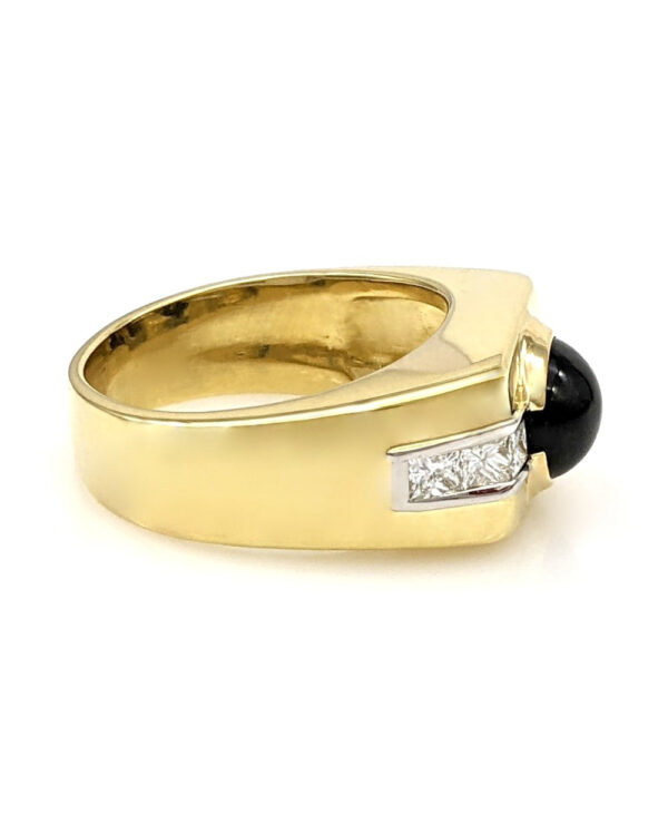 Discover the epitome of elegance and craftsmanship with this distinguished men’s ring, crafted from lustrous 18K high polish yellow gold. At the heart of this sophisticated piece lies a captivating 4.98-carat black star sapphire, exquisitely set in a half bezel that accentuates its mesmerizing natural sheen. Flanking this centerpiece are six princess-cut diamonds, totaling 1.00 carat, each channel set with precision to enhance brilliance and fire. These diamonds boast a clarity of VS and a stunning G color, contributing to the ring’s overall allure. Measuring 12.5mm x 9.5mm x 6.5mm and weighing 24.3 grams, this remarkable ring offers a substantial feel and impeccable fit for the discerning gentleman, perfectly blending timeless style with modern sophistication.