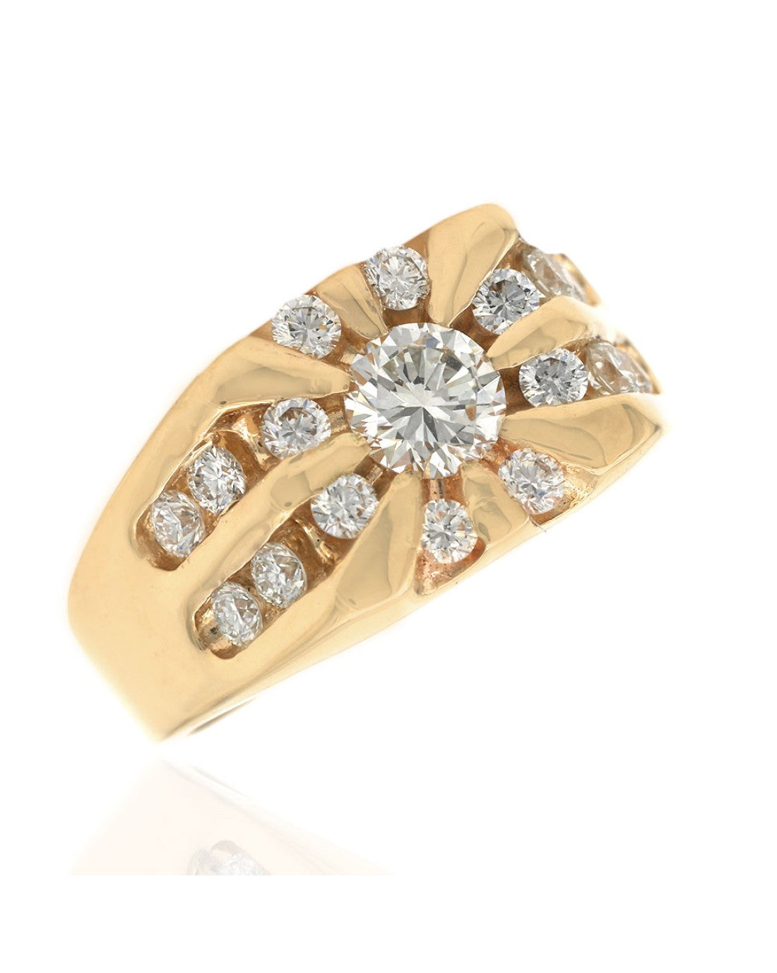 The Gentleman’s Diamond Sun Motif Tapered Band is a sophisticated statement of elegance and craftsmanship. Made for discerning tastes, it features a striking sun motif central to its design, highlighted by a brilliant array of precisely set diamonds. Each diamond is carefully selected for its clarity and brilliance, grouped around a central stone that anchors the motif. The tapered band, crafted from premium gold, complements the diamond setting, ensuring a comfortable and secure fit. Its polished finish accentuates the overall design, while the quality craftsmanship guarantees both durability and timeless appeal. With its balance of classic style and intricate detailing, this band is not just a piece of jewelry but a statement of refinement and taste.