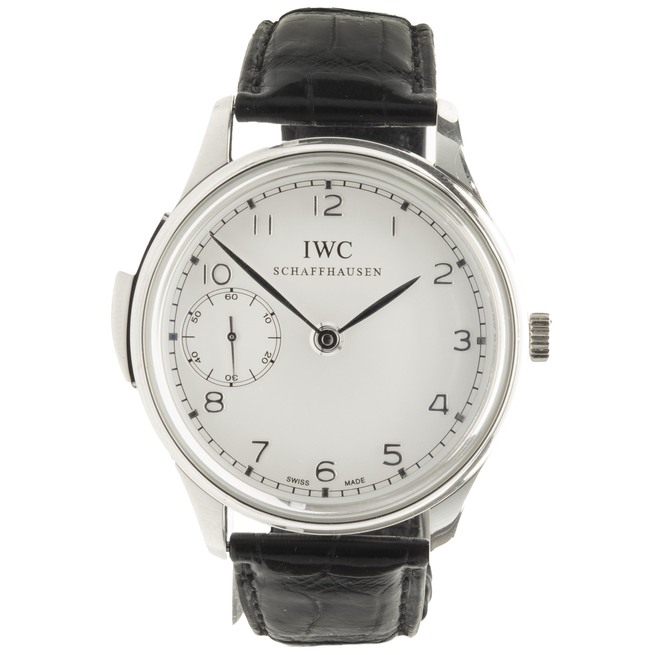 Indulge in the epitome of horological excellence with the IWC Platinum Portugieser Minute Repetition. This remarkable timepiece, crafted from luxurious platinum, showcases an elegant 42mm case that houses a refined silver Arabic dial, accentuated by the watch’s manual wind movement. The sapphire crystal offers durability and a clear view of the striking dial, while the intricate craftsmanship of the minute repeater mechanism is a testament to Swiss precision. Gracefully secured by a black crocodile strap, this watch combines timeless sophistication with the exceptional mechanical artistry IWC is renowned for. Elevate your collection with this exquisite blend of aesthetic beauty and technical mastery.