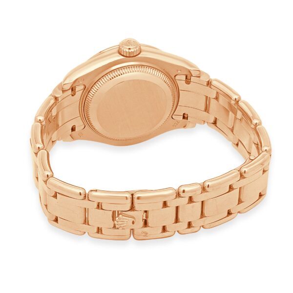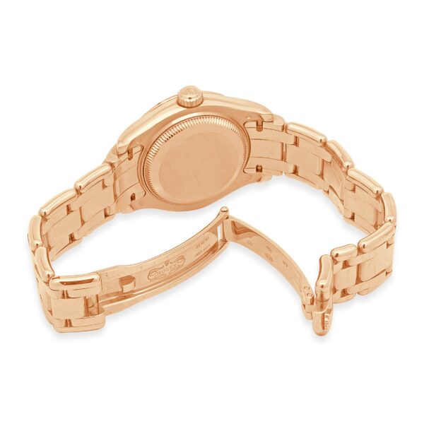 Immerse yourself in the refined elegance of the Rolex Pearlmaster 29 Ref. 80285, a masterpiece crafted entirely in 18k Everose gold, Rolex’s exclusive rose-gold alloy known for its warm and enduring hue. This exquisite timepiece features a compact 29mm Oyster case, offering a sophisticated, jewelry-forward profile accentuated by a flawless mirror-grade polish. The striking mother-of-pearl dial is adorned with diamond-set Roman numerals, harmonizing perfectly with the factory 18k rose gold diamond bezel, bringing a timeless allure to the watch. The Pearlmaster bracelet, with its rounded five-piece links and concealed Crownclasp, flows seamlessly from the case, ensuring both comfort and a high-luster finish on any wrist. Water-resistant to 100 meters and powered by a precise automatic movement, this Rolex embodies both technical prowess and luxurious craftsmanship, making it a standout addition to any collection.