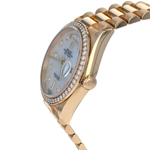 Exuding an unmatched aura of opulence and refinement, the Rolex Day-Date 36 Yellow Gold Diamonds President 128348RBR is a masterclass in horological excellence. Crafted in luxurious 18k yellow gold, this iconic timepiece is adorned with a diamond-set bezel that radiates sophistication. The 36mm case houses a mesmerizing white mother-of-pearl dial, elegantly adorned with diamond-set index markers that gleam beautifully against its iridescent backdrop. At the helm of its precision lies the Rolex caliber 3255 automatic movement, ensuring impeccable reliability.